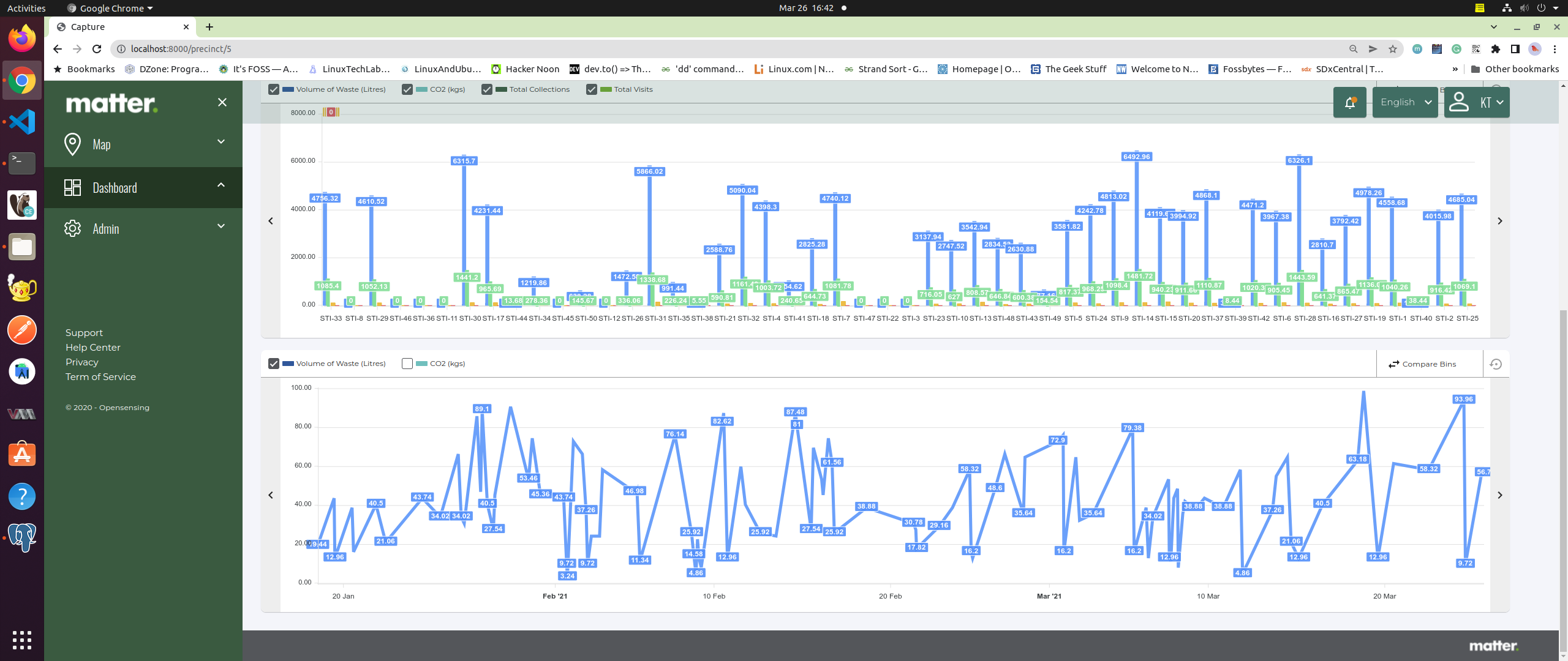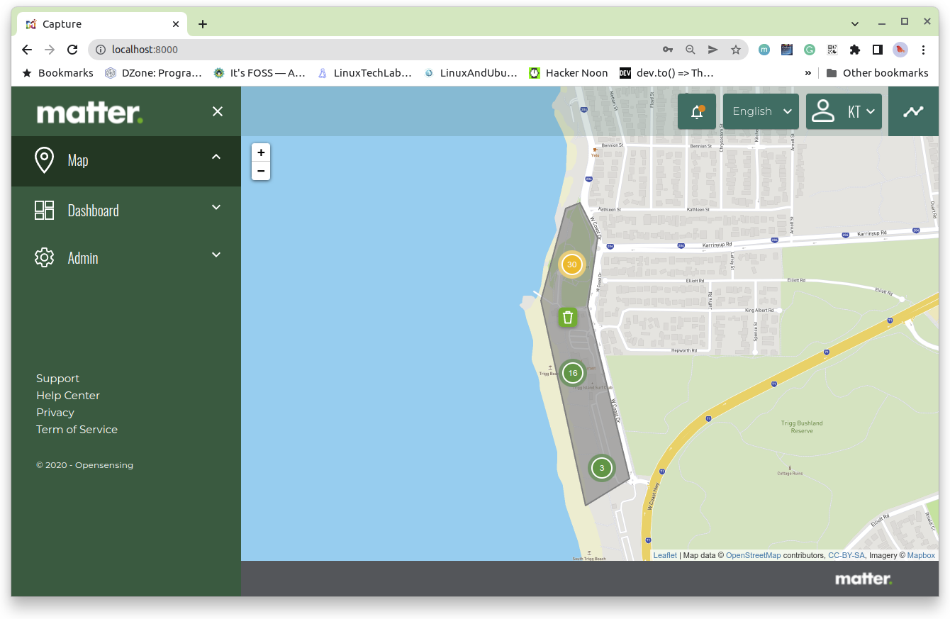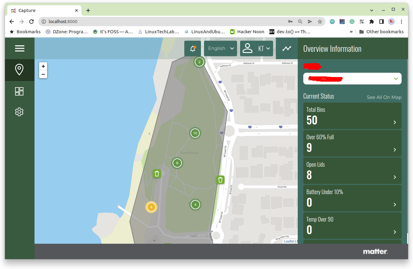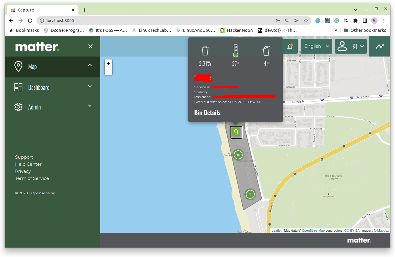 - Bin sensor management: Laravel / LeafletJS / PostgreSQL / TimescaleDB / Postgis